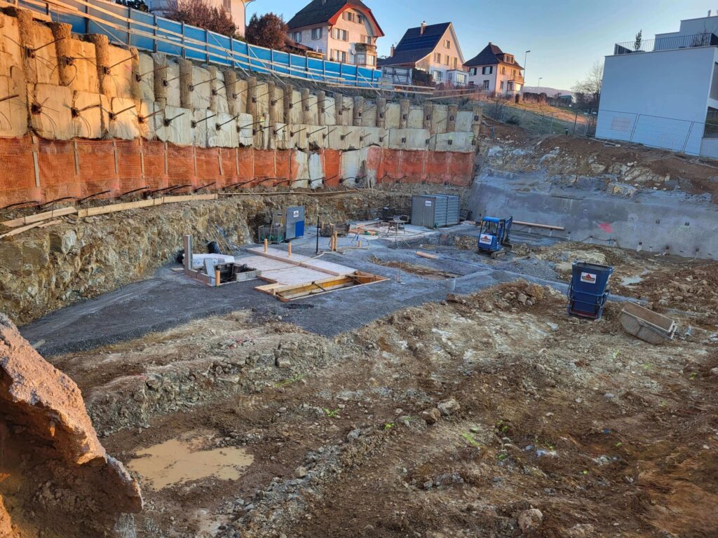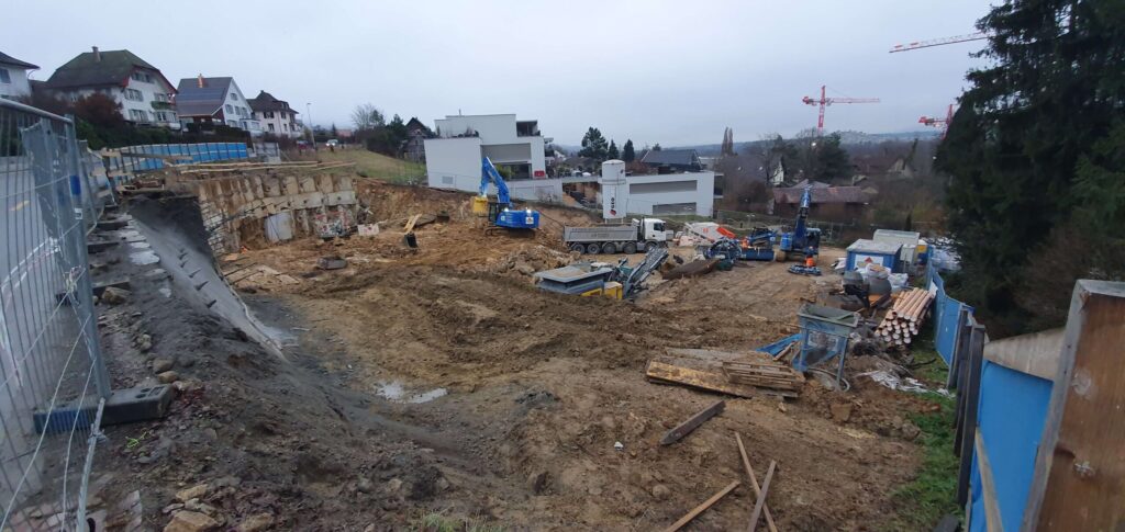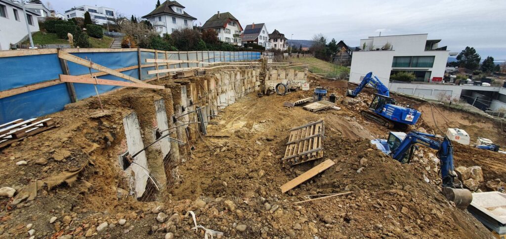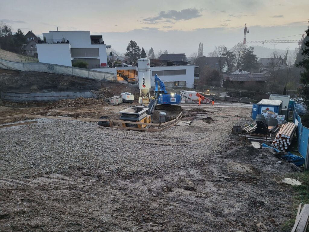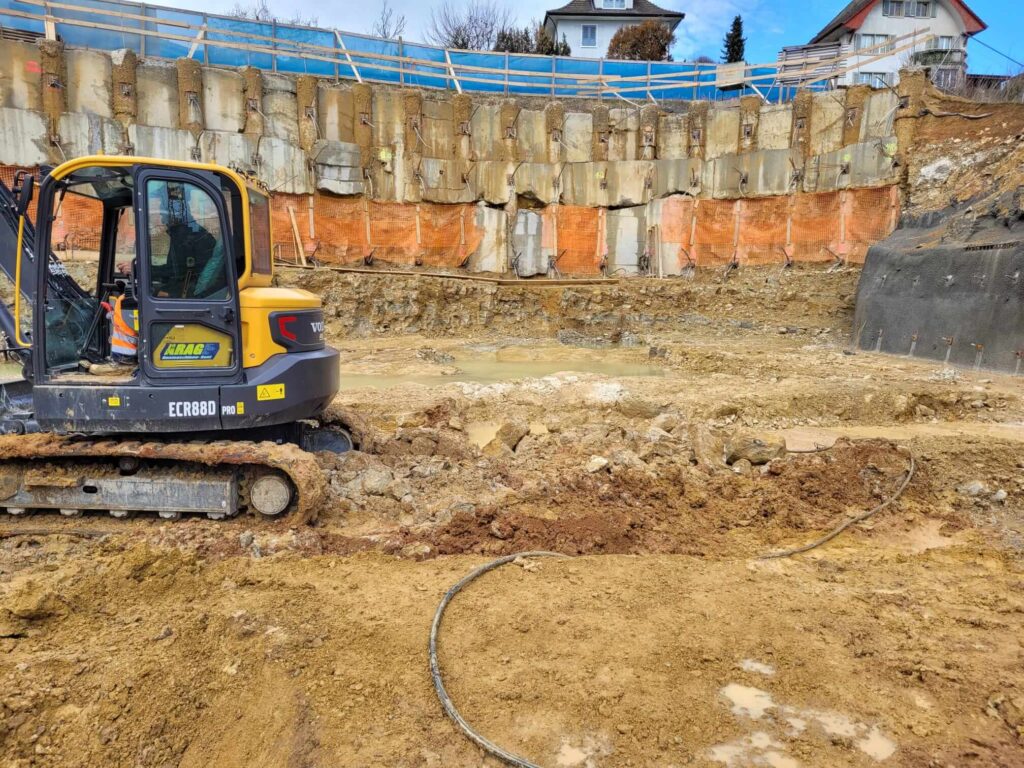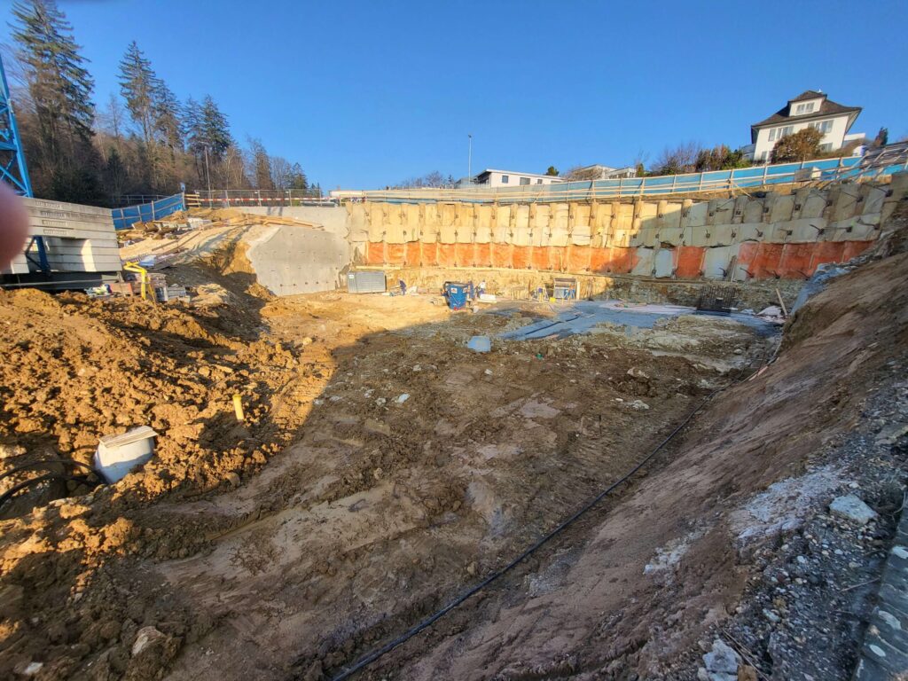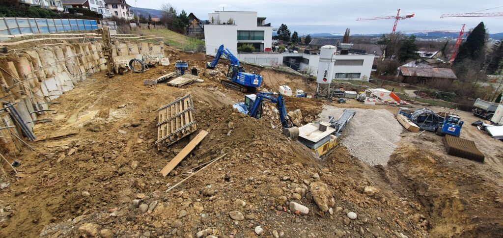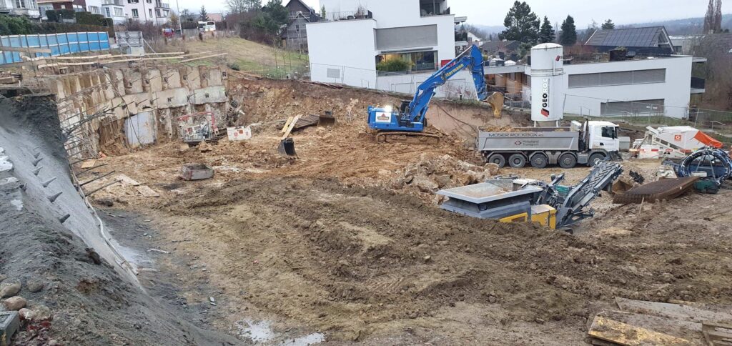 Abbruch, Aushub und Baumeister aus einer Hand: Schadstoffsanierung; Bohrpfahlwand direkt an Hauptstrasse, Baulogistik; Herzförmiger Grundriss, runde Wände, Sichtbeton Typ 4.
