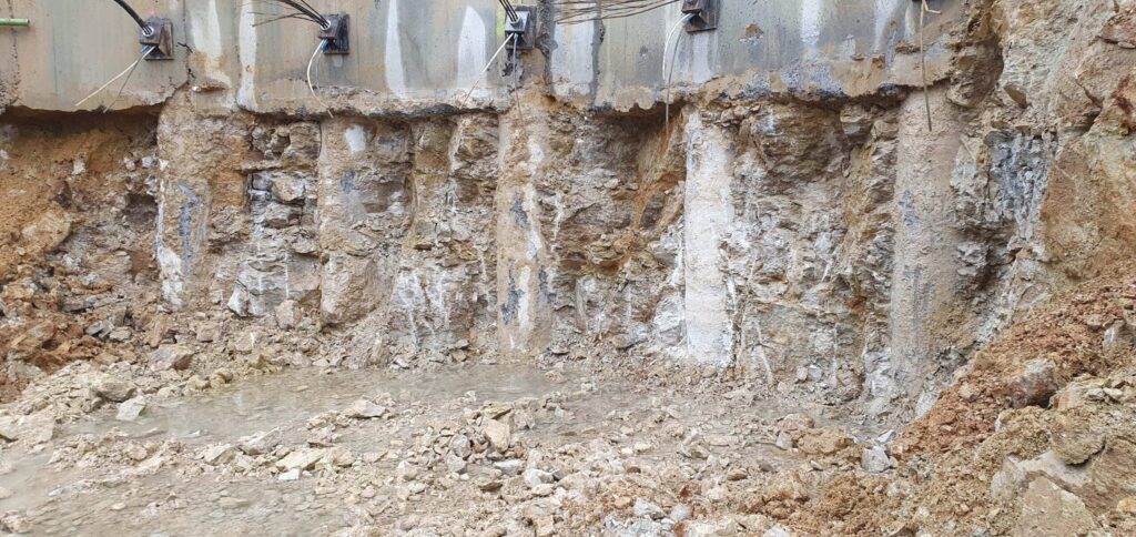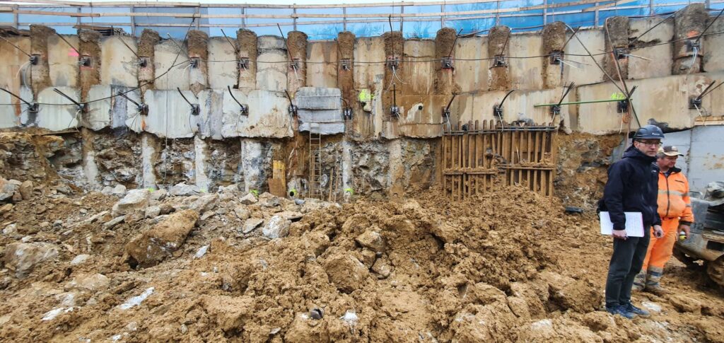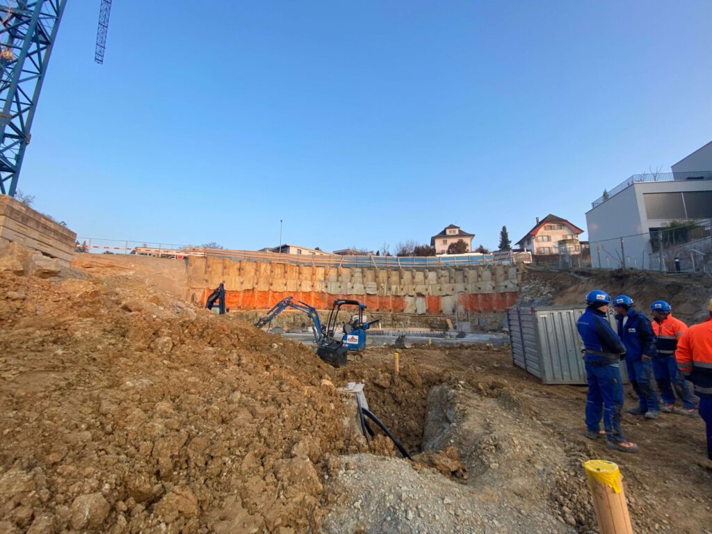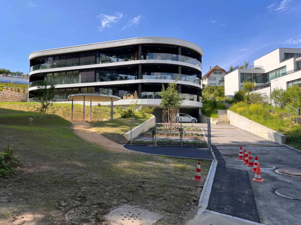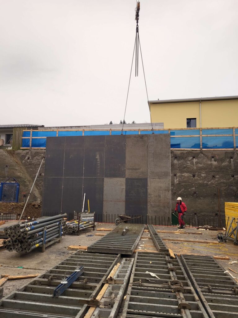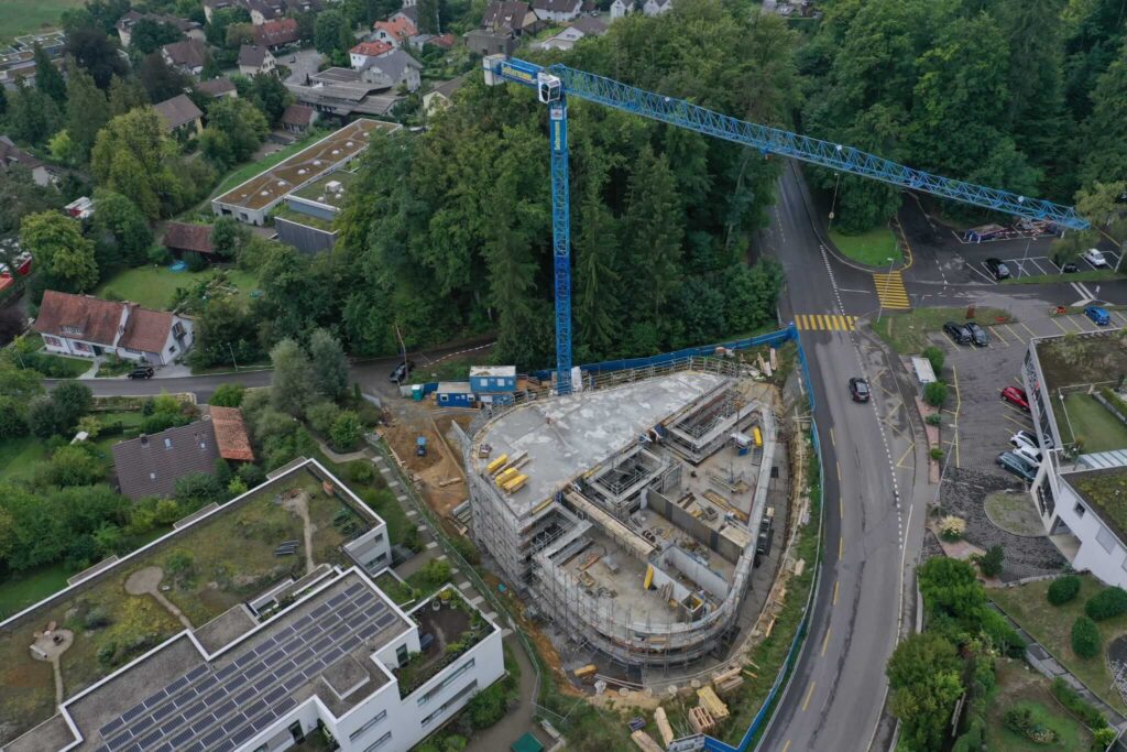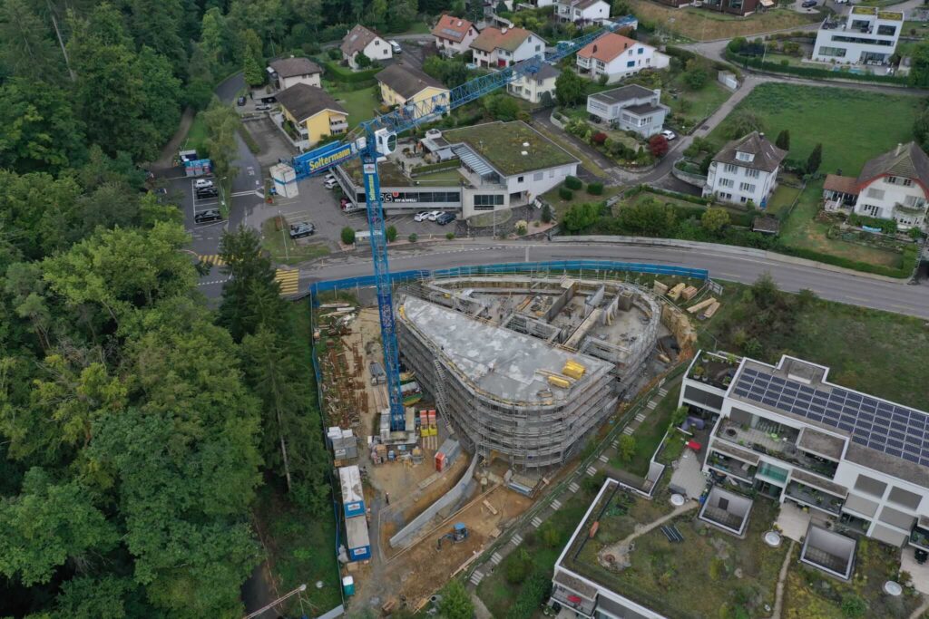 Abbruch, Aushub und Baumeister aus einer Hand: Schadstoffsanierung; Bohrpfahlwand direkt an Hauptstrasse, Baulogistik; Herzförmiger Grundriss, runde Wände, Sichtbeton Typ 4.